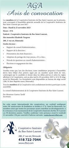 sont convoqués à l’assemblée générale annuelle de la Coopérative funéraire du